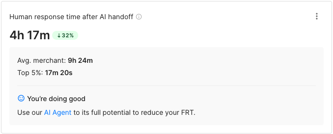 This metric gives you visibility into how quickly your team engages with customers after AI intervention, helping you identify and improve areas where the human handover experience can be made smoother and faster.