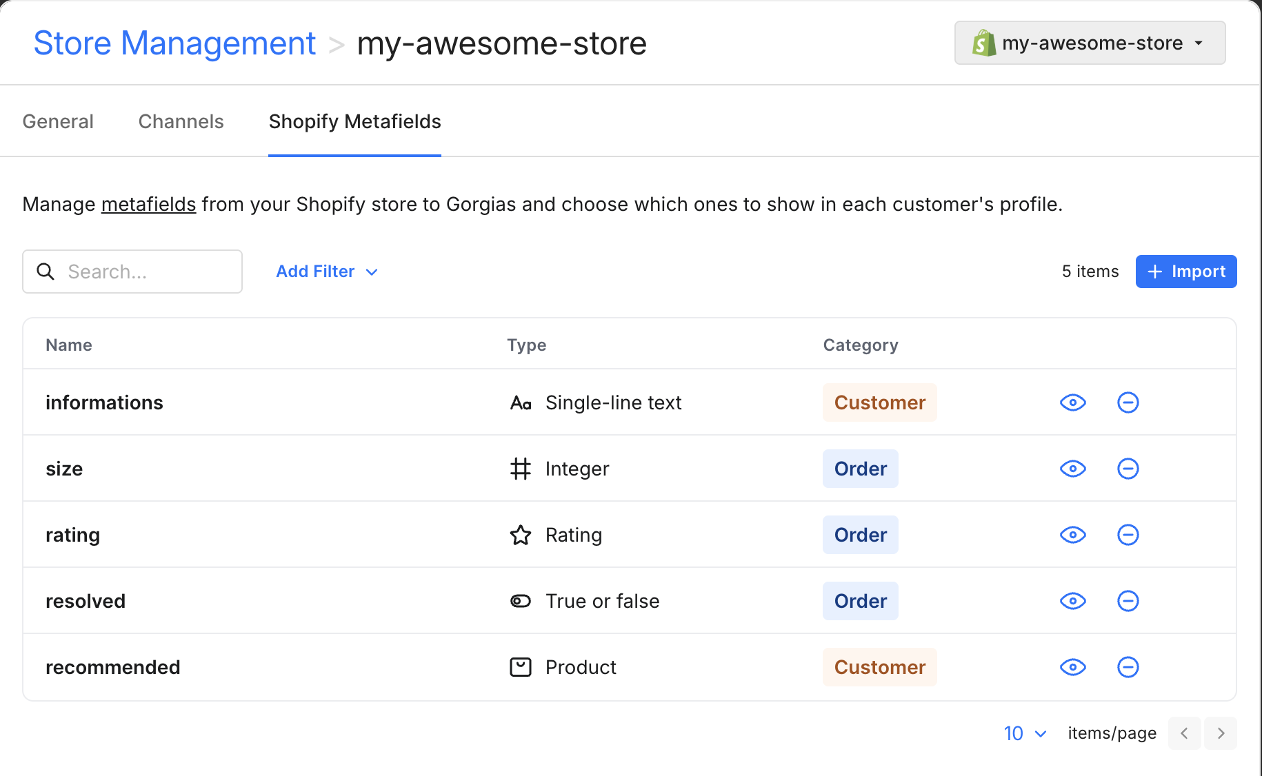 Select up to 10 metafields of each type (customer, order and draft order) and import them in your Helpdesk. Once theyโre imported, you can determine if you want the metafield to be visible or not in the ticket using the hide/show icon.