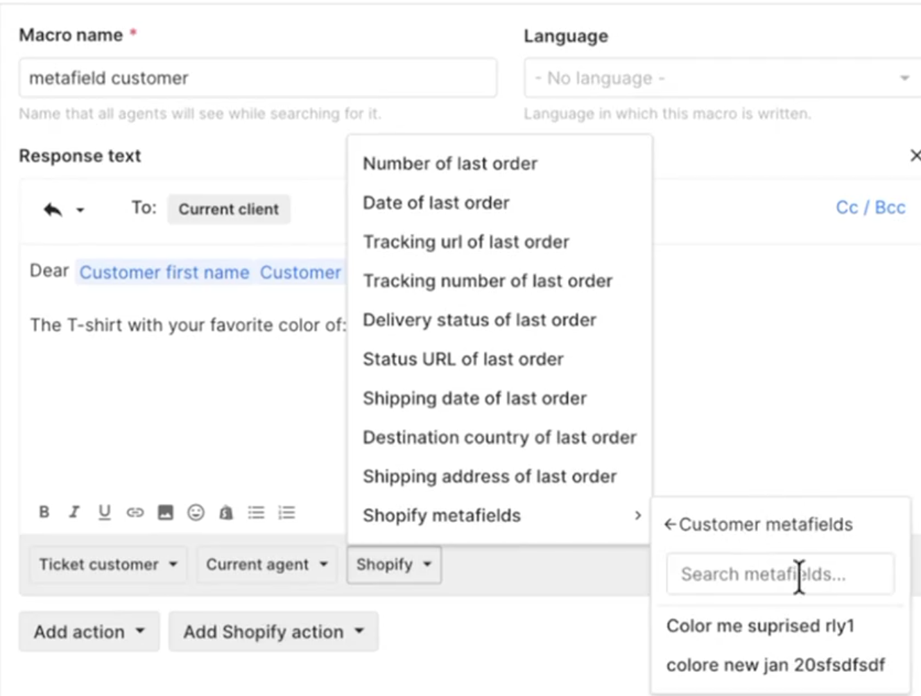 You are now able to pick your most relevant Shopify metafields and pull them in to your Helpdesk. These are specific data points related to your orders, draft orders or customers in Shopify. You can now import these into Gorgias, decide where and how you see them and leverage them in macros to speed up your specific processes.